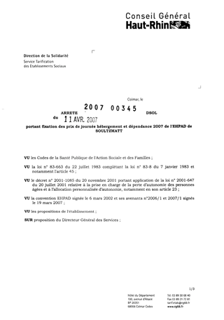 portant fixation des prix de journée hébergement et dépendance 2007 de l'EHPAD de SOULTZMATT. Resumé Pièces jointes ARRETE Assemblée : Non défini Date : 11/04/2007 Rapporteur : Non défini Collectivité : Conseil départemental du Haut-Rhin Direction : Non défini Service : Service de la Tarification des Etablissements Domaine : Prix de Journée Commission :