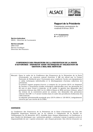 Dans le cadre de la Conférence des Financeurs de la Prévention de la Perte d'Autonomie, un concours annuel d'environ 2 M€ est alloué par la Caisse Nationale de Solidarité pour l'Autonomie pour améliorer l’accès aux équipements et aides techniques individuelles et le développement d’actions collectives de prévention. Le présent rapport propose d'ouvrir, à compter du 1er janvier 2019, un dispositif de soutien à l'acquisition d'aides techniques individuelles pour les personnes de 60 ans et plus vivant à domicile, et de confier la gestion des demandes des personnes relevant des GIR 5 et 6 à MSA d'Alsace et MSA services d'Alsace, selon les termes de la convention jointe en annexe. Les demandes des personnes relevant des GIR 1 à 4 seront traitées dans le cadre des procédures d'allocation de l'APA domicile. La dépense prévisionnelle maximale pour 2019 s'élève à 120 000 €, intégralement couverts par une recette de la CNSA.