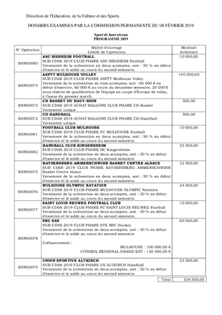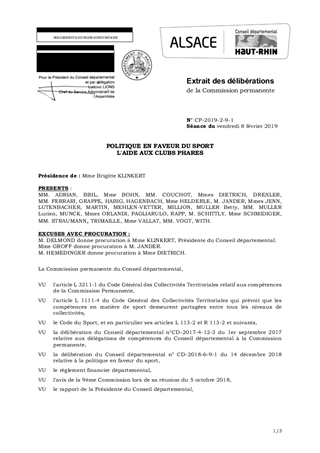 Il vous est proposé de voter l'individualisation des aides prévues au B.P 2019 dans le cadre du soutien aux 9 clubs phares du Département dont 7 clubs sont également les organisateurs des Mercredis Sportifs. Il s’agit de : FC Mulhouse Football (10 000 €), FC Saint-Louis Neuweg (10 000 €), ASC Biesheim Football (10 000 €), Handball Club Kingersheim (25 500 €), Union Sportive Altkirch Handball (25 500 €), SBC Scorpions Hockey (60 000 €), ASPTT Mulhouse Volley (140 000 €), KABCA Basket (32 500 €) et Mulhouse Olympic Natation (24 000 €), ainsi que 2 comités départementaux (handball et basket) qui se chargent de l’achat des ballons offerts aux clubs d’accueil des Mercredis Sportifs (1 000 €). Le total de l'enveloppe à engager dans ce rapport s'élève à 338 500 € en dépenses de fonctionnement. La Commission Sports et Vie Associative a donné son avis favorable le 5 octobre 2018.