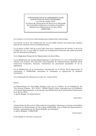 Il est proposé l'allocation d'une subvention de 250 000 € à l'Association de Secours et d'Entraide des Conseillers Généraux et anciens Conseillers Généraux du Département du Haut-Rhin, ainsi que l'approbation de la convention pour le versement de la subvention.