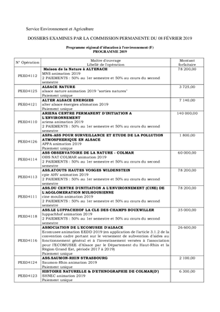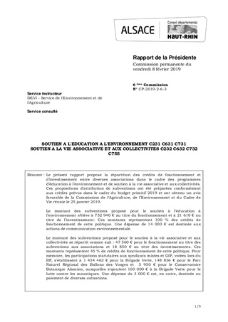 Le présent rapport propose la répartition des crédits de fonctionnement et d’investissement entre diverses associations dans le cadre des programmes d’éducation à l’environnement et de soutien à la vie associative et aux collectivités. Ces propositions d’attribution de subventions ont été préparées conformément aux crédits prévus dans le cadre du budget primitif 2019 et ont obtenu un avis favorable de la Commission de l’Agriculture, de l’Environnement et du Cadre de Vie réunie le 25 janvier 2019. Le montant des subventions proposé pour le soutien à l’éducation à l’environnement s’élève à 752 940 € au titre du fonctionnement et à 21 610 € au titre de l’investissement. Ces montants représentent 100 % des crédits de fonctionnement de cette politique. Une dépense de 14 000 € est destinée aux actions de communication environnementale. Le montant des subventions proposé pour le soutien à la vie associative et aux collectivités se répartit comme suit : 47 560 € pour le fonctionnement au titre des subventions aux associations et 18 850 € au titre des investissements. Ces montants représentent 45 % de crédits de fonctionnement de cette politique. Pour mémoire, les participations statutaires aux syndicats mixtes et GIP, votées lors du BP, s'établissent à 1 434 463 € pour la Brigade Verte, 148 836 € pour le Parc Naturel Régional des Ballons des Vosges et 5 950 € pour le Conservatoire Botanique Alsacien, auxquelles s'ajoutent 100 000 € à la Brigade Verte pour le lutte contre les moustiques. Une dépense de 3 000 € est, en outre, destinée au paiement de diverses cotisations.