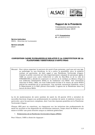 Pour mieux organiser le parcours de santé d’une personne, quel que soit son âge, sa pathologie ou son handicap, la loi a prévu la possibilité, pour le médecin traitant en particulier, de faire appel à une Plateforme Territoriale d’Appui. Comme le public concerné est très majoritairement composé de personnes âgées, l’ARS en accord avec notre Collectivité et celle du Bas-Rhin et de la ville de STRASBOURG a décidé de construire ce service en le confiant au Réseau d’Appui aux médecins Généralistes (RAG) et en l’adossant aux MAIA. Une convention associant le RAG, l’ARS, ces trois Collectivités locales et le réseau de santé RODA précise les modalités de ce partenariat. Une seconde convention bilatérale, entre le Département et le RAG prévoit d’accueillir 2 agents de la Plateforme dans les locaux de deux MAIA.