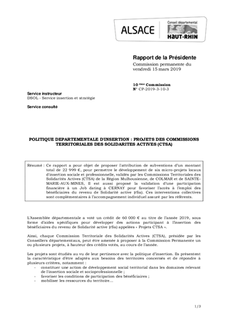 Ce rapport a pour objet de proposer l'attribution de subventions d’un montant total de 22 999 €, pour permettre le développement de six micro-projets locaux d'insertion sociale et professionnelle, validés par les Commissions Territoriales des Solidarités Actives (CTSA) de la Région Mulhousienne, de COLMAR et de SAINTE-MARIE-AUX-MINES, Il est aussi proposé la validation d’une participation financière à un Job dating à CERNAY pour favoriser l’accès à l’emploi des bénéficiaires du revenu de Solidarité active (rSa). Ces interventions collectives sont complémentaires à l’accompagnement individuel assuré par les référents.
