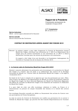 Le présent rapport a pour objet d'approuver le Contrat de Destination Annuel Massif des Vosges, d'attribuer une subvention de 11 684 € au Département des Vosges pour les actions d'animation et une subvention de 13 396 € à Alsace Destination Tourisme pour les actions de promotion et de valorisation. Ce rapport a fait l'objet d'un avis favorable à la Commission Aménagement du Territoire et Tourisme lors de la réunion du 8 février 2019.