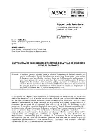 Le présent rapport s'inscrit dans le pilotage dynamique de la carte scolaire du secteur mulhousien. Il s'agit de valider une stratégie en deux temps : une gestion de l'urgence des sureffectifs constatés dans les établissements mulhousiens et une vision prospective avec la création d'un nouvel établissement. Il propose d'approuver la création d'un nouveau collège implanté à Mulhouse et dans l'attente de son ouverture, des nouvelles modifications des aires de recrutement des collèges du territoire de la Ville de Mulhouse et des communes de première et deuxième couronnes pour la rentrée de septembre 2019.
