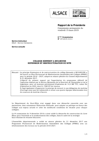 Le principe d’extension et de restructuration du collège Kennedy à MULHOUSE a été inscrit au Plan Pluriannuel de Modernisation Immobilière des Collèges (PPMIC) pour la période 2018 – 2027, adopté en séance plénière du Conseil départemental le 21 décembre 2017. L’objectif du présent rapport est l’approbation du programme définitif de l'opération élaboré par le Service Bâtiments de la Direction de l’Immobilier et de la Logistique, pour un montant prévisionnel d’opération de 14,4 M€ TTC, valeur fin d’opération en 2022, dont 8, 3 M€ HT de travaux. Il s’agit également d’approuver le principe de recourir à une délégation de maîtrise d’ouvrage ainsi que les indemnités à verser aux quatre équipes sélectionnées lors du concours de maîtrise d’œuvre.