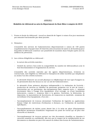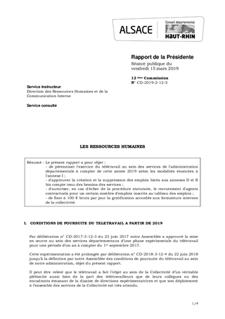 Le présent rapport a pour objet : - de pérenniser l'exercice du télétravail au sein des services de l'administration départementale à compter de cette année 2019 selon les modalités énoncées à l'annexe I ; - d'approuver la création et la suppression des emplois listés aux annexes II et II bis compte tenu des besoins des services ; - d'autoriser, en cas d'échec de la procédure statutaire, le recrutement d'agents contractuels pour un certain nombre d'emplois inscrits au tableau des emplois ; - de fixer à 100 € bruts par jour la gratification accordée aux formateurs internes de la collectivité.