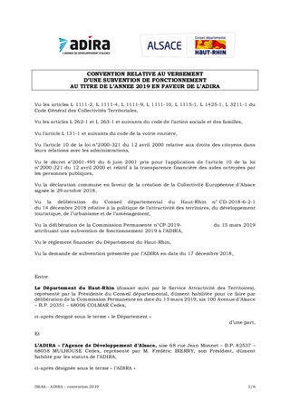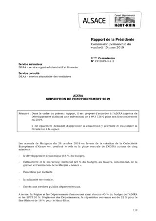 Dans le cadre du présent rapport, il est proposé d'accorder à l'ADIRA (Agence de Développement d'Alsace) une subvention de 1 043 736 € pour son fonctionnement en 2019. Il est également demandé d'approuver la convention y afférente et d'autoriser la Présidente à la signer.