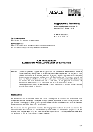 L’objet du présent rapport est d’approuver un partenariat expérimental entre le Département du Haut-Rhin et la Fondation du Patrimoine en vue de lancer une collecte de fonds, en faveur de porteurs de projets publics ou associatifs, destinée à sauvegarder et restaurer uniquement « le Patrimoine de Territoire » protégé au titre des Monuments Historiques. Ce partenariat s’inscrit dans le cadre de la mise en œuvre du Plan Patrimoine 68. A cet effet, il est proposé d'attribuer et d'autoriser le versement de la cotisation 2019, d'un montant de 2 000 €. La Commission Culture et Patrimoine (7ème) réunie le 25 janvier 2019 a donné un avis favorable à ce dossier.