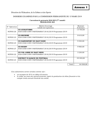 Le présent rapport a pour objet de voter l’individualisation des aides prévues au BP 2019 dans le cadre du soutien à l’animation sportive et de l’encouragement au sport. Le montant global des subventions de fonctionnement proposé dans ce rapport s’élève à 324 954 € et concerne l’aide aux comités départementaux (254 954 €), aux associations encourageant le sport scolaire (60 000 €) et au Conseil Départemental des Sports (10 000 €). Ce dossier a fait l’objet d’un avis favorable lors de la Commission "Sports et Vie associative" (9ème) du 1er février 2019.