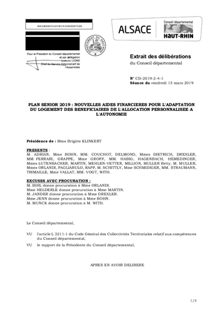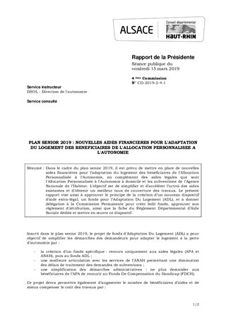 Dans le cadre du plan senior 2019, il est prévu de mettre en place de nouvelles aides financières pour l’adaptation du logement des bénéficiaires de l’Allocation Personnalisée à l’Autonomie, en complément des aides légales que sont l'Allocation Personnalisée à l'Autonomie à domicile et les subventions de l’Agence Nationale de l’Habitat. L’objectif est de simplifier et d’accélérer l’octroi des aides existantes et d’obtenir un meilleur taux de couverture des travaux. Le présent rapport vise ainsi à approuver le principe de la création d’un nouveau dispositif d’aide extra-légal, un fonds pour l’Adaptation Du Logement (ADL), et à donner délégation à la Commission Permanente pour créer ledit fonds, approuver son règlement d’attribution, ainsi que la fiche du Règlement Départemental d’Aide Sociale dédiée et mettre en œuvre ce dispositif.