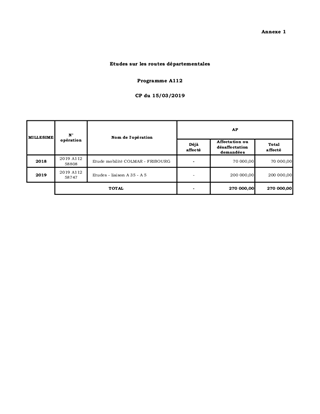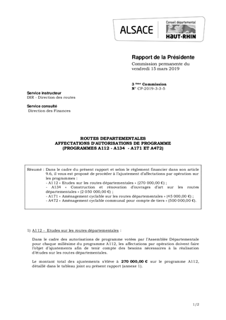 Dans le cadre du présent rapport et selon le règlement financier dans son article 9.6, il vous est proposé de procéder à l’ajustement d’affectations par opération sur les programmes : - A112 « Etudes sur les routes départementales » (270 000,00 €) ; - A134 « Construction et rénovation d’ouvrages d’art sur les routes départementales » (2 050 000,00 €) ; - A171 « Aménagement cyclable sur les routes départementales » (45 000,00 €) ; - A472 « Aménagement cyclable communal pour compte de tiers » (500 000,00 €).