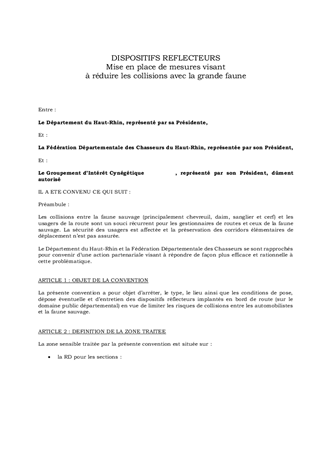 Le présent rapport a pour objet d'approuver les termes de la convention-type relative à la mise en place de mesures visant à réduire les collisions avec la grande faune en partenariat avec la Fédération des Chasseurs du Haut-Rhin.