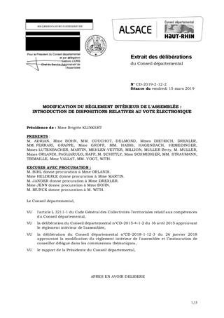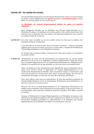 Depuis la remise à niveau de l'équipement audiovisuel de la salle de l'Assemblée, intervenue en décembre 2018, le vote électronique a été expérimenté lors de la séance de la Commission permanente du 18 janvier 2019. L'emploi de cette fonctionnalité pour les délibérations adoptées par le Conseil départemental et la Commission permanente, nécessite la modification du règlement intérieur de l'Assemblée.