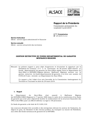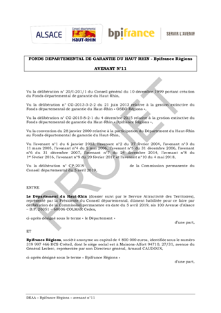 Le présent rapport a pour objet d'approuver et d'autoriser la signature par la Présidente de l'avenant n°11 à la convention du 28 janvier 2000 relative au Fonds départemental de garantie du Haut-Rhin signée entre le Département du Haut-Rhin et SOFARIS Régions (devenu Bpifrance Régions) portant sur la gestion extinctive du fonds départemental de garantie. A ce titre, une somme de 8 093,32 € sera reversée au Département du Haut-Rhin. Ce rapport a fait l'objet d'un avis favorable de la Commission Aménagement du Territoire et Tourisme en date du 29 mars 2019.