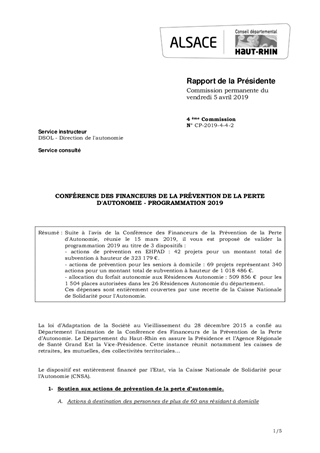 CONFÉRENCE DES FINANCEURS DE LA PRÉVENTION DE LA PERTE D'AUTONOMIE - PROGRAMMATION 2019