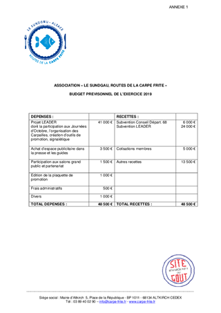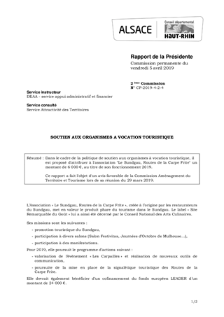 Dans le cadre de la politique de soutien aux organismes à vocation touristique, il est proposé d'attribuer à l'association "Le Sundgau, Routes de la Carpe Frite" un montant de 6 000 €, au titre de son fonctionnement 2019. Ce rapport a fait l'objet d'un avis favorable de la Commission Aménagement du Territoire et Tourisme lors de sa réunion du 29 mars 2019.