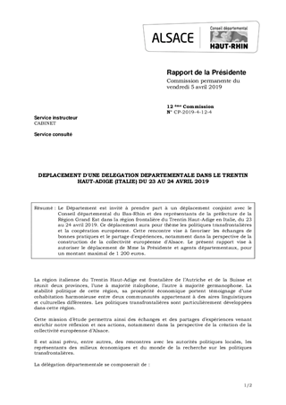 Le Département est invité à prendre part à un déplacement conjoint avec le Conseil départemental du Bas-Rhin et des représentants de la préfecture de la Région Grand Est dans la région frontalière du Trentin Haut-Adige en Italie, du 23 au 24 avril 2019. Ce déplacement aura pour thème les politiques transfrontalières et la coopération européenne. Cette rencontre vise à favoriser les échanges de bonnes pratiques et le partage d'expériences, notamment dans la perspective de la construction de la collectivité européenne d'Alsace. Le présent rapport vise à autoriser le déplacement de Mme la Présidente et agents départementaux, pour un montant maximal de 1 200 euros.