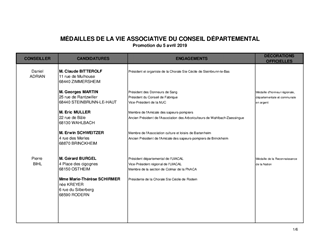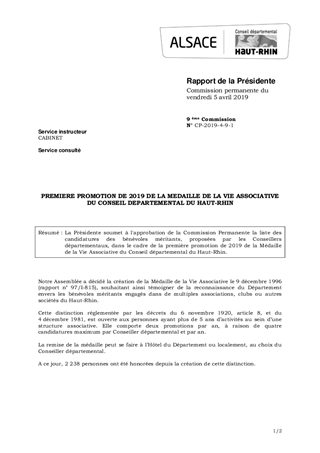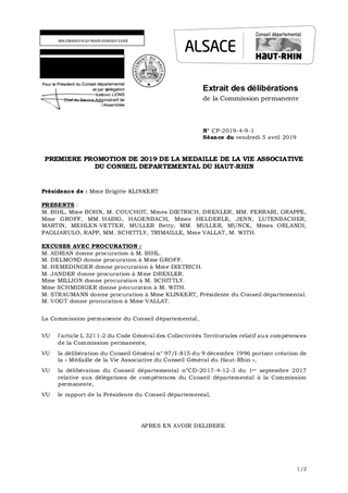 PREMIERE PROMOTION DE 2019 DE LA MEDAILLE DE LA VIE ASSOCIATIVE DU CONSEIL DEPARTEMENTAL DU HAUT-RHIN