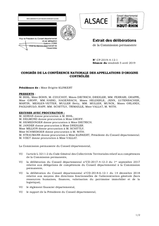 Le présent rapport a pour objet d’attribuer une subvention départementale d’un montant de 4 000 euros à l’Association des Viticulteurs d’Alsace pour l’organisation du Congrès National des Appellations d’Origine Contrôlée (CNAOC) qui aura lieu à Colmar et Voegtlinshoffen, les 24, 25 et 26 avril 2019.