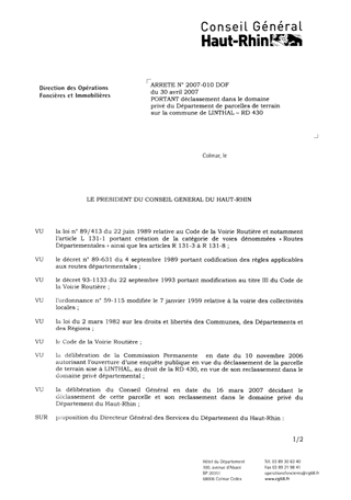 portant déclassement dans le domaine privé du Département de parcelles de terrain sur la commune de LINTHAL - RD 430. Resumé Pièces jointes ARRETE Assemblée : Non défini Date : 30/04/2007 Rapporteur : Non défini Collectivité : Conseil départemental du Haut-Rhin Direction : Non défini Service : Service du Patrimoine et du droit des Sols Domaine : Déclassement de voirie Commission :