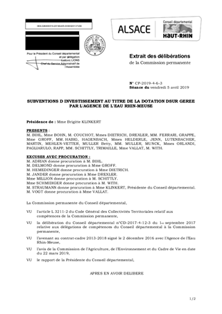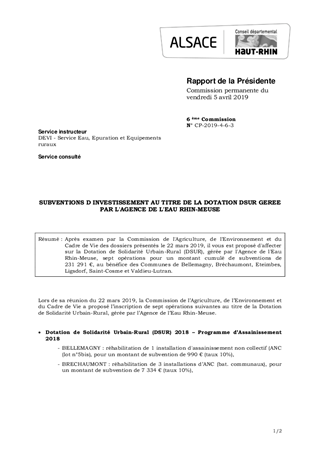 Après examen par la Commission de l'Agriculture, de l'Environnement et du Cadre de Vie des dossiers présentés le 22 mars 2019, il vous est proposé d'affecter sur la Dotation de Solidarité Urbain-Rural (DSUR), gérée par l'Agence de l'Eau Rhin-Meuse, sept opérations pour un montant cumulé de subventions de 231 291 €, au bénéfice des Communes de Bellemagny, Bréchaumont, Eteimbes, Ligsdorf, Saint-Cosme et Valdieu-Lutran.