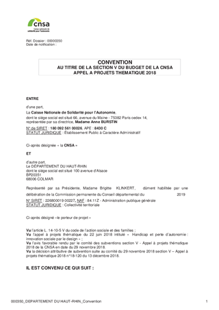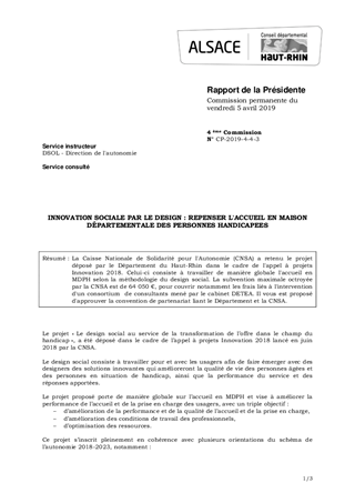 La Caisse Nationale de Solidarité pour l'Autonomie (CNSA) a retenu le projet déposé par le Département du Haut-Rhin dans le cadre de l'appel à projets Innovation 2018. Celui-ci consiste à travailler de manière globale l'accueil en MDPH selon la méthodologie du design social. La subvention maximale octroyée par la CNSA est de 64 050 €, pour couvrir notamment les frais liés à l'intervention d'un consortium de consultants mené par le cabinet DETEA. Il vous est proposé d'approuver la convention de partenariat liant le Département et la CNSA.