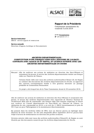 Afin de renforcer ses actions de médiation en direction des Haut-Rhinois et notamment les jeunes, le service des Archives départementales réalise une fresque vidéo sur l’histoire de l’Alsace. Certains fonds vidéo sont issus des archives audiovisuelles d’Alsace 20, de Seppia ou utilisent des documents des Archives départementales du Doubs. La signature des contrats correspondants établis à titre gracieux nécessite un passage préalable en Commission Permanente. Ce projet a été évoqué lors de la 7ème Commission réunie le 30 novembre 2018.