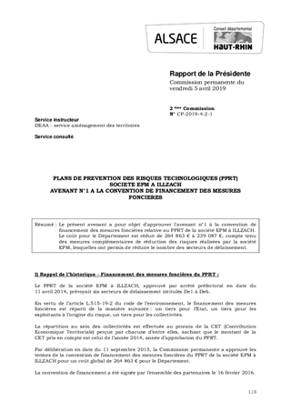 Le présent avenant a pour objet d'approuver l'avenant n°1 à la convention de financement des mesures foncières relative au PPRT de la société EPM à ILLZACH. Le coût pour le Département est réduit de 264 863 € à 239 087 €, compte tenu des mesures complémentaires de réduction des risques réalisées par la société EPM, lesquelles ont permis de réduire le nombre des secteurs de délaissement.