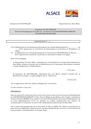 CONVENTION FINANCIÈRE AVEC LA COMMUNE DE WATTWILLER POUR LA RÉALISATION DE L'ÉTUDE D'AMÉNAGEMENT DE LA RD 431 À LA HAUTEUR DU HARTMANNSWILLERKOPF