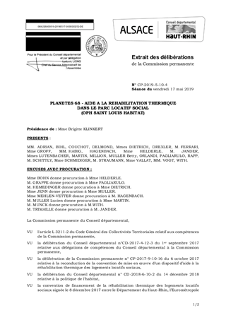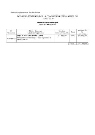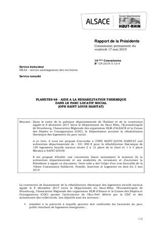 Dans le cadre de la politique départementale de l’habitat et de la convention signée le 8 décembre 2017 entre le Département du Haut Rhin, l’Eurométropole de Strasbourg, l’Association Régionale des organismes HLM d’ALSACE et la Caisse des Dépôts et Consignations (CDC), le Département soutient la réhabilitation thermique des logements du parc social. A ce titre, il vous est proposé d’accorder à l’OPH SAINT-LOUIS HABITAT une subvention départementale de : 341 850 € pour la réhabilitation thermique de 129 logements locatifs sociaux situés 2 à 12 place de la Gare et 1 à 4 place Mermoz à SAINT-LOUIS. Il est proposé d’établir une convention fixant notamment le montant de la subvention départementale et ses modalités de versement et d'autoriser la Présidente à signer ce document. Cette aide a fait l’objet d’un avis favorable de la 10ème Commission Solidarité, Famille, Insertion et Logement en date du 3 mai 2019.