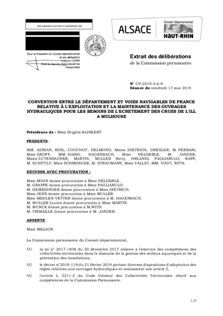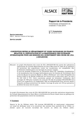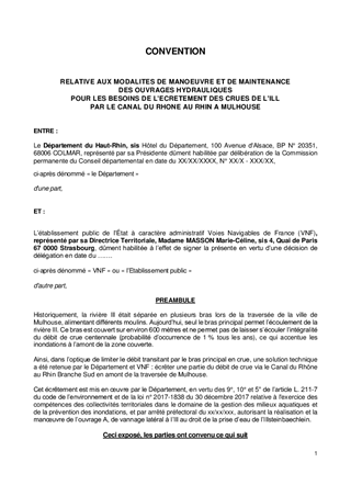 CONVENTION ENTRE LE DÉPARTEMENT ET VOIES NAVIGABLES DE FRANCE RELATIVE À L'EXPLOITATION ET LA MAINTENANCE DES OUVRAGES HYDRAULIQUES POUR LES BESOINS DE L'ECRETEMENT DES CRUES DE L'ILL A MULHOUSE