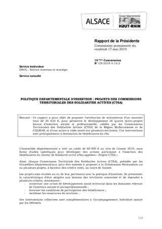 Ce rapport a pour objet de proposer l'attribution de subventions d’un montant total de 26 630 €, pour permettre le développement de quatre micro-projets locaux d'insertion sociale et professionnelle, validés par les Commissions Territoriales des Solidarités Actives (CTSA) de la Région Mulhousienne et de COLMAR, et d’une action à visée santé sur plusieurs territoires. Ces interventions sont principalement à destination de bénéficiaires du rSa.
