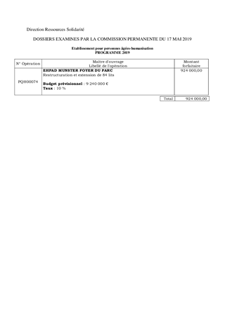 Le présent rapport a pour objet d’attribuer une subvention d’investissement de 924 000 € à l’EHPAD « Le foyer du Parc » à MUNSTER dans le cadre de son projet de restructuration et d’extension et de procéder, en application du règlement financier, à l’affectation de l’autorisation de programme correspondante pour le montant de subvention précité.