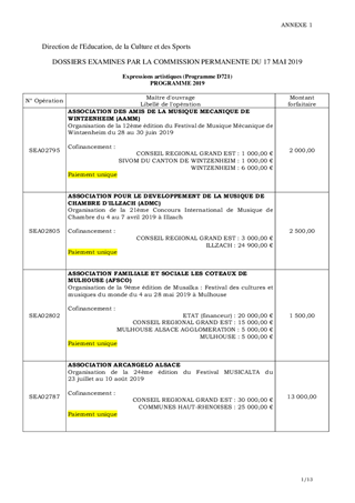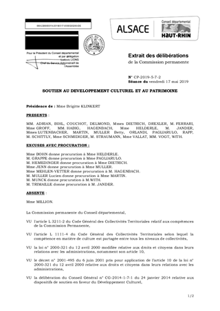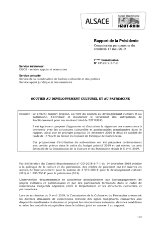 Le présent rapport propose, au titre du soutien au développement culturel et au patrimoine, d’attribuer et d'autoriser le versement des subventions de fonctionnement pour un montant total de 727 030 €. Il est également proposé d’approuver et d'autoriser la signature des conventions à intervenir avec les structures culturelles et patrimoniales mentionnées dans le rapport, ainsi que de proroger jusqu’au 31 décembre 2020 le délai de validité de l’aide de 14 932 € en faveur du Conseil de Fabrique de Bartenheim. Ces propositions d’attribution de subventions ont été préparées conformément aux crédits prévus dans le cadre du budget primitif 2019 et ont obtenu un avis favorable de la Commission de la Culture et du Patrimoine réunie le 5 avril 2019.