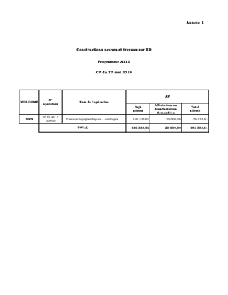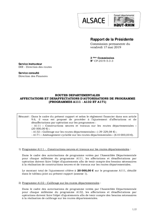 Dans le cadre du présent rapport et selon le règlement financier dans son article 9.6, il vous est proposé de procéder à l’ajustement d’affectations et de désaffectations par opération sur les programmes : - A111 « Constructions neuves et travaux sur les routes départementales » (20 000,00 €) ; - A132 « Calibrage sur les routes départementales » (-39 229,08 €) ; - A171 « Aménagement cyclable sur les routes départementales » (610 000,00 €).