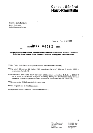 portant fixation des prix de journée hébergement et dépendance 2007 de l'EHPAD - unité de soins longue durée du centre médical de Luppach à BOUXWILLER. Resumé Pièces jointes ARRETE Assemblée : Non défini Date : 03/05/2007 Rapporteur : Non défini Collectivité : Conseil départemental du Haut-Rhin Direction : Non défini Service : Service de la Tarification des Etablissements Domaine : Prix de Journée Commission :