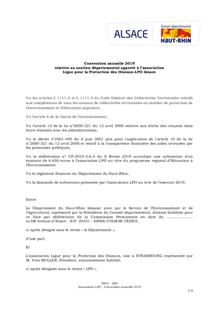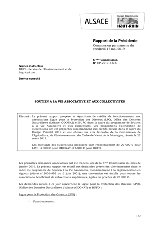 Le présent rapport propose la répartition de crédits de fonctionnement aux associations Ligue pour la Protection des Oiseaux (LPO), Office des Données Naturalistes d'Alsace (ODONAT) et BUFO dans la cadre du programme de Soutien à la Vie Associative et aux Collectivités. Ces propositions d’attribution de subventions ont été préparées conformément aux crédits prévus dans le cadre du Budget Primitif 2019 et ont obtenu un avis favorable de la Commission de l'Agriculture, de l'Environnement, du Cadre de Vie et de la Montagne, réunie le 22 mars 2019. Les montants des subventions proposées sont respectivement de 20 000 € pour LPO, 17 000 € pour ODONAT et 6 000 € pour BUFO.