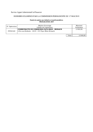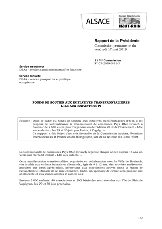 Dans le cadre du Fonds de soutien aux initiatives transfrontalières (FSIT), il est proposé de subventionner la Communauté de communes Pays Rhin-Brisach à hauteur de 2 500 euros pour l’organisation de l’édition 2019 de l’événement « L’Île aux enfants », les 29 et 30 juin prochains, à Vogelgrun. Ce rapport a fait l’objet d’un avis favorable de la Commission Actions, Relations Internationales et Promotion du Bilinguisme, lors de sa réunion du 3 mai 2019.