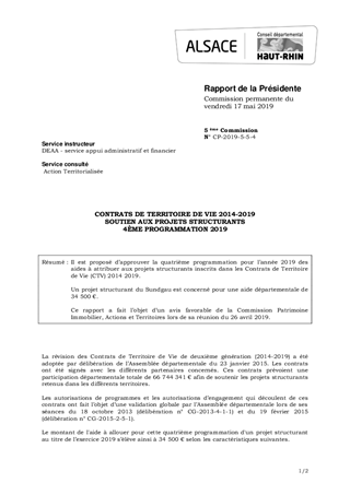 Il est proposé d’approuver la quatrième programmation pour l’année 2019 des aides à attribuer aux projets structurants inscrits dans les Contrats de Territoire de Vie (CTV) 2014 2019. Un projet structurant du Sundgau est concerné pour une aide départementale de 34 500 €. Ce rapport a fait l’objet d’un avis favorable de la Commission Patrimoine Immobilier, Actions et Territoires lors de sa réunion du 26 avril 2019.