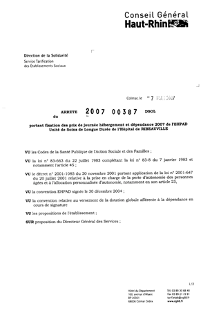 portant fixation des prix de journée hébergement et dépendance 2007 de l'EHPAD - unité de soins de longue durée de l'hôpital de RIBEAUVILLE. Resumé Pièces jointes ARRETE Assemblée : Non défini Date : 07/05/2007 Rapporteur : Non défini Collectivité : Conseil départemental du Haut-Rhin Direction : Non défini Service : Service de la Tarification des Etablissements Domaine : Prix de Journée Commission :