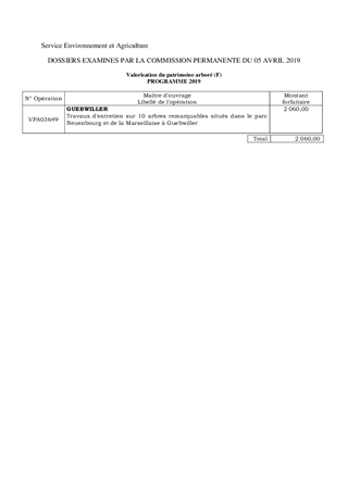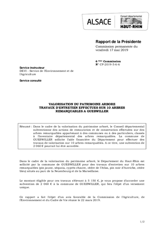 Dans le cadre de la valorisation du patrimoine arboré, le Conseil départemental subventionne des actions de restauration et de conservation effectuées sur des arbres remarquables appartenant à des communes ou à des particuliers, classés à l’inventaire départemental des arbres remarquables. La commune de GUEBWILLER sollicite l’aide financière du Département pour effectuer des travaux de valorisation sur 10 arbres remarquables. A ce titre, une subvention de 2 060 € pourrait lui être accordée.