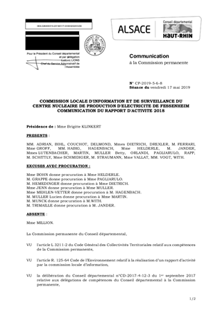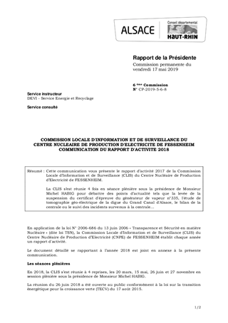 COMMISSION LOCALE D'INFORMATION ET DE SURVEILLANCE DU CENTRE NUCLEAIRE DE PRODUCTION D'ELECTRICITE DE FESSENHEIMCOMMUNICATION DU RAPPORT D'ACTIVITE 2018