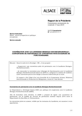 Dans le cadre de la Stratégie « OR », il est proposé : - d'approuver une convention-cadre de partenariat avec le Landkreis Breisgau-Hochschwarzwald ; - de renouveler la convention pour échanges de fonctionnaires avec le Landkreis Breisgau-Hochschwarzwald datant de 2009 en y intégrant la création de tandems. Cette convention pourra être élargie à d’autres collectivités par la suite. Ce rapport a fait l’objet d’un avis favorable de la Commission Actions, Relations Internationales et Promotion du Bilinguisme, réunie le 3 mai dernier.