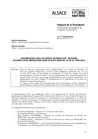 Dans le cadre du partenariat entre le Département et le Powiat de Wroclaw, il vous est proposé d’approuver l'accueil d’une délégation polonaise du 24 au 27 juin 2019 dans le Haut-Rhin et d’autoriser la prise en charge des frais correspondants, évalués à 5 000 €. Outre l’organisation de la réunion annuelle du Comité mixte, instance de pilotage du partenariat entre les deux collectivités, ce déplacement aura pour thème le vieillissement de la population et la prise en charge de la perte d’autonomie. Ce rapport a fait l’objet d’un avis favorable de la Commission Actions, Relations Internationales et Promotion du Bilinguisme lors de sa réunion du 3 mai dernier.