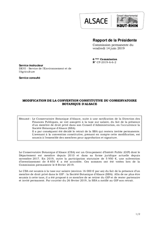 Le Conservatoire Botanique d'Alsace, suite à une notification de la Direction des Finances Publiques, se voit assujetti à la taxe sur salaire, du fait de la présence d'un membre de droit privé dans son Conseil d'Administration, en l'occurrence la Société Botanique d'Alsace (SBA). Il a par conséquent été décidé le retrait de la SBA qui restera invitée permanente. L'avenant à la convention constitutive, prenant en compte cette modification, est soumis à l'ensemble des membres pour approbation et signature.