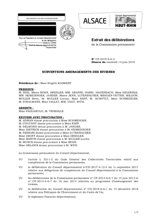 Dans le cadre des subventions accordées par le Département du Haut-Rhin au titre de l’aménagement des rivières en 2019, il vous est proposé d’accorder les subventions détaillées en annexe au Syndicat mixte du bassin de l’Ill, mandataire des syndicats de rivières, pour des opérations de renaturation, pour un montant global de 200 832,80 €. La Commission de l’Agriculture, de l’Environnement et du Cadre de Vie a donné un avis favorable en date du 10 mai 2019.
