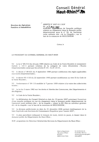 portant organisation de l'enquête publique relative au classement dans le domaine public départemental sous le n° 50, de l'ancienne route militaire dite "de la Chapelle", sur le ban de la commune de REGUISHEIM. Resumé Pièces jointes ARRETE Assemblée : Non défini Date : 07/05/2007 Rapporteur : Non défini Collectivité : Conseil départemental du Haut-Rhin Direction : Non défini Service : Service du Patrimoine et du droit des Sols Domaine : Déclassement de voirie Commission :