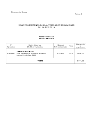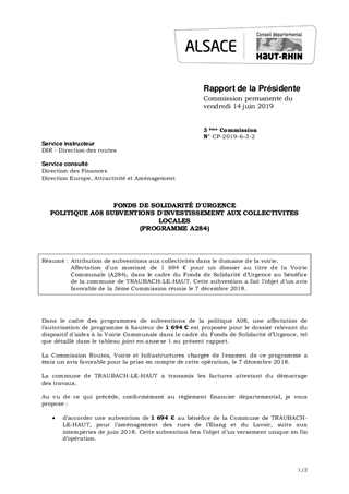 Attribution de subventions aux collectivités dans le domaine de la voirie. Affectation d'un montant de 1 694 € pour un dossier au titre de la Voirie Communale (A284), dans le cadre du Fonds de Solidarité d’Urgence au bénéfice de la commune de TRAUBACH-LE-HAUT. Cette subvention a fait l’objet d’un avis favorable de la 3ème Commission réunie le 7 décembre 2018.