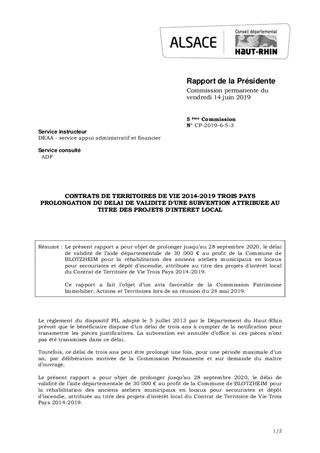 Le présent rapport a pour objet de prolonger jusqu’au 28 septembre 2020, le délai de validité de l’aide départementale de 30 000 € au profit de la Commune de BLOTZHEIM pour la réhabilitation des anciens ateliers municipaux en locaux pour secouristes et dépôt d'incendie, attribuée au titre des projets d'intérêt local du Contrat de Territoire de Vie Trois Pays 2014-2019. Ce rapport a fait l’objet d’un avis favorable de la Commission Patrimoine Immobilier, Actions et Territoires lors de sa réunion du 24 mai 2019.